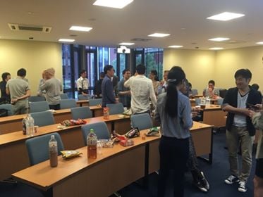 At the social gathering after moving the place, drinks and snacks were prepared, and freshmen, active students and graduates got together.