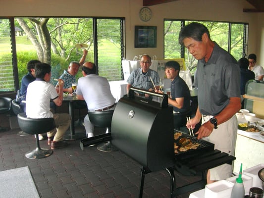 また、プレー終了後は、ゴルフ場で納涼を楽しみながら、成績発表を兼ねた懇親会(バーベキュー)を開催。お肉やお酒を味わいながら、疲れを癒やし、話に花を咲かせました。最後の表彰では、山田製油(12期 山田康一さんの企業)様からの豪華賞品が贈られ、大興奮!