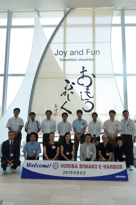 ホスピタリティあふれる歓迎ムードの中、船舶をイメージして作られた建物内に入ります。解放的なエントランスの正面には堀場製作所の社是「おもしろおかしく」と書かれた「帆」が迎えてくれます。
